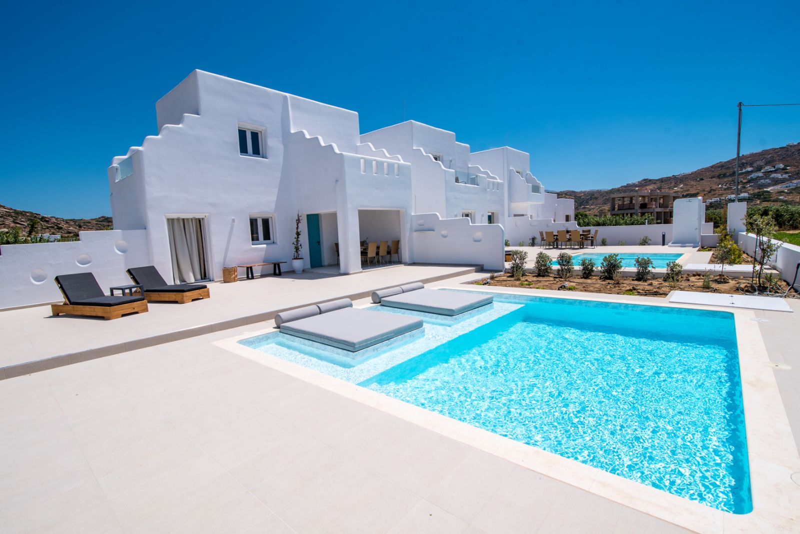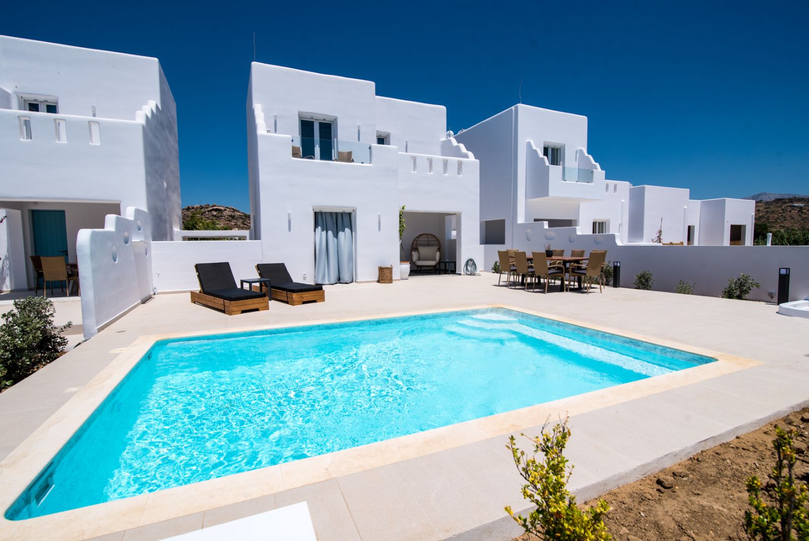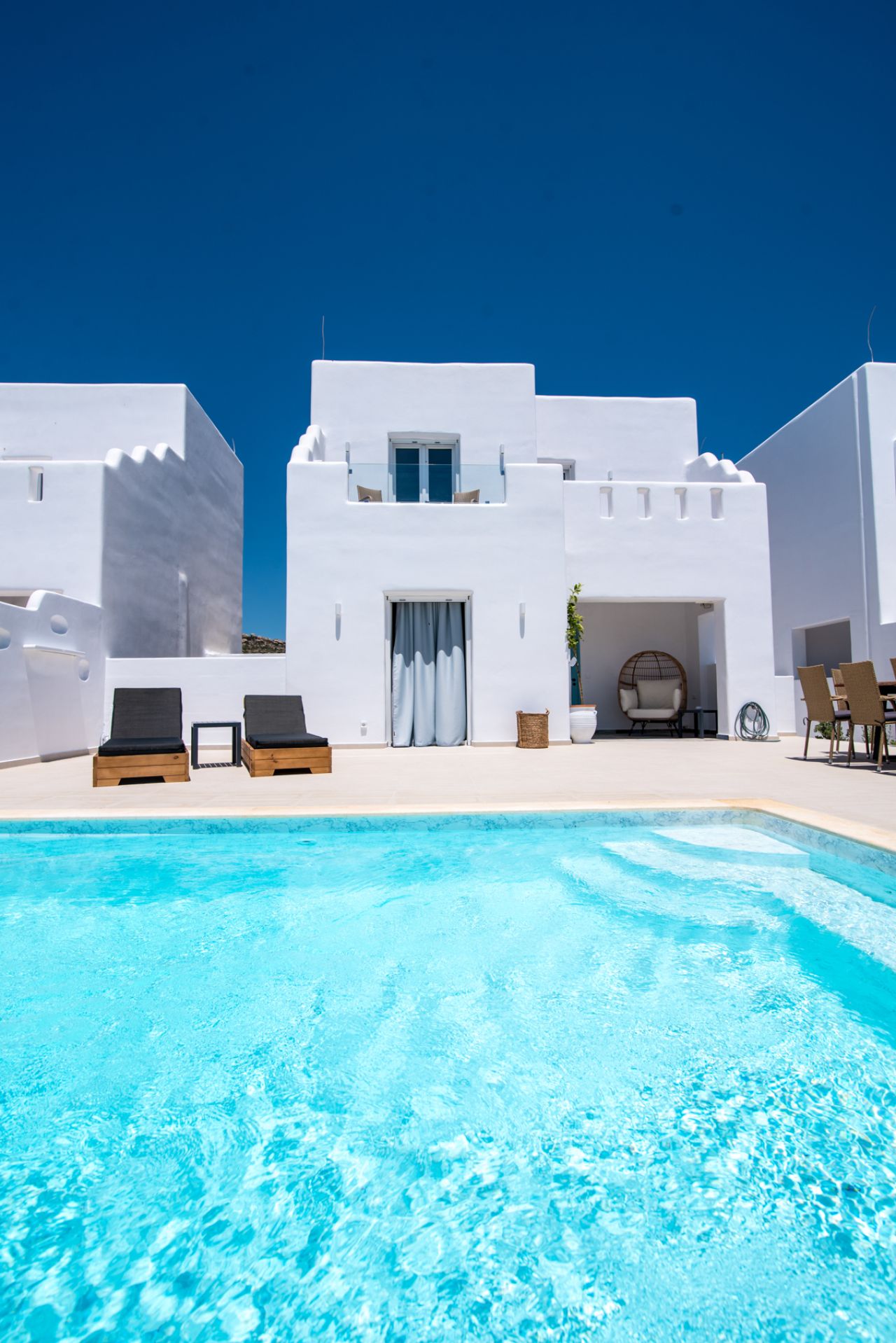 Within the villa premises lies a magnificent private swimming pool (6m x 5m), surrounded by meticulously designed outdoor living spaces that invite relaxation under the brilliant Cycladic sun. The expansive terrace accommodates comfortable lounging areas, alfresco dining settings, and tranquil corners for contemplation or conversation, all enhanced by the property's privacy and natural beauty.