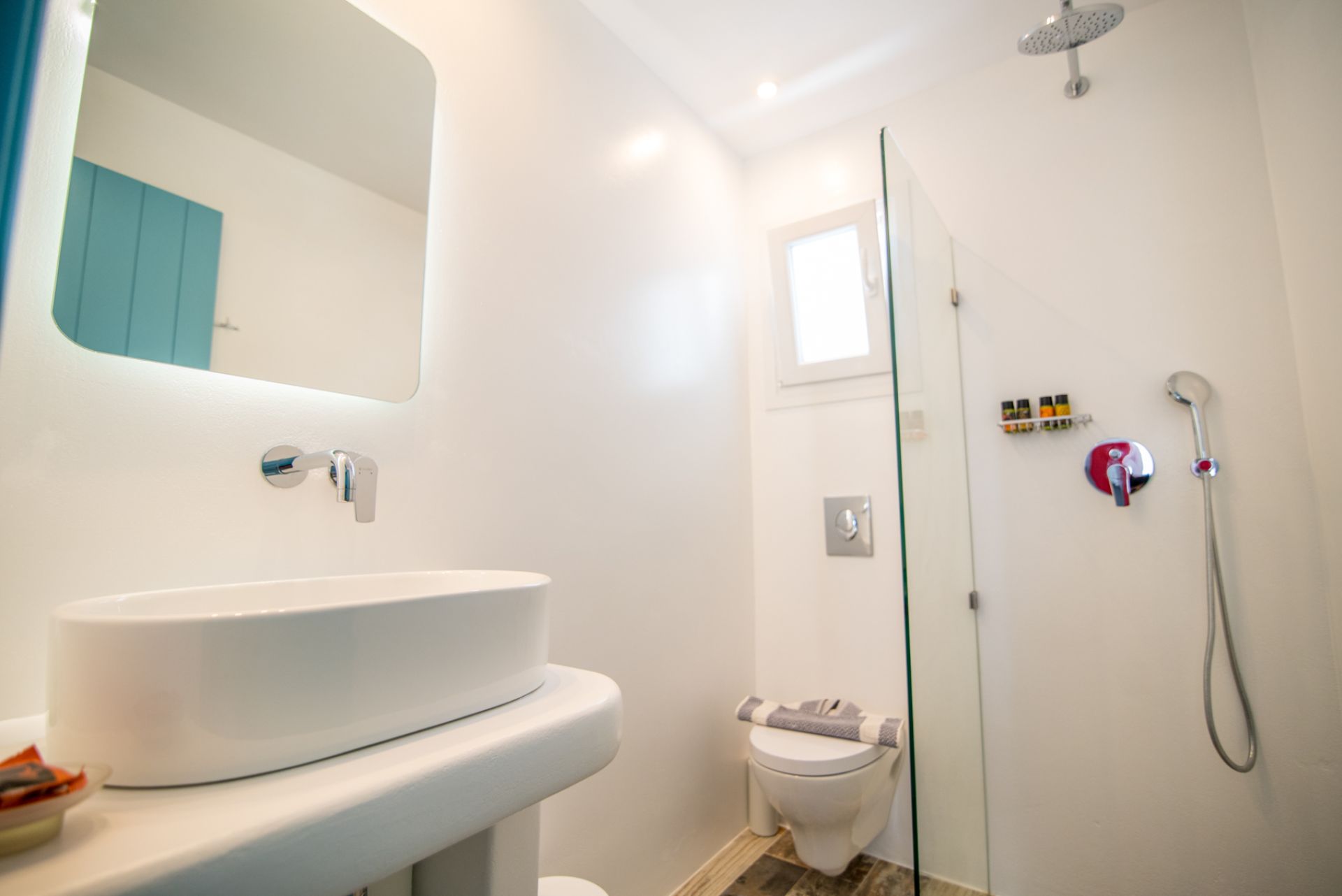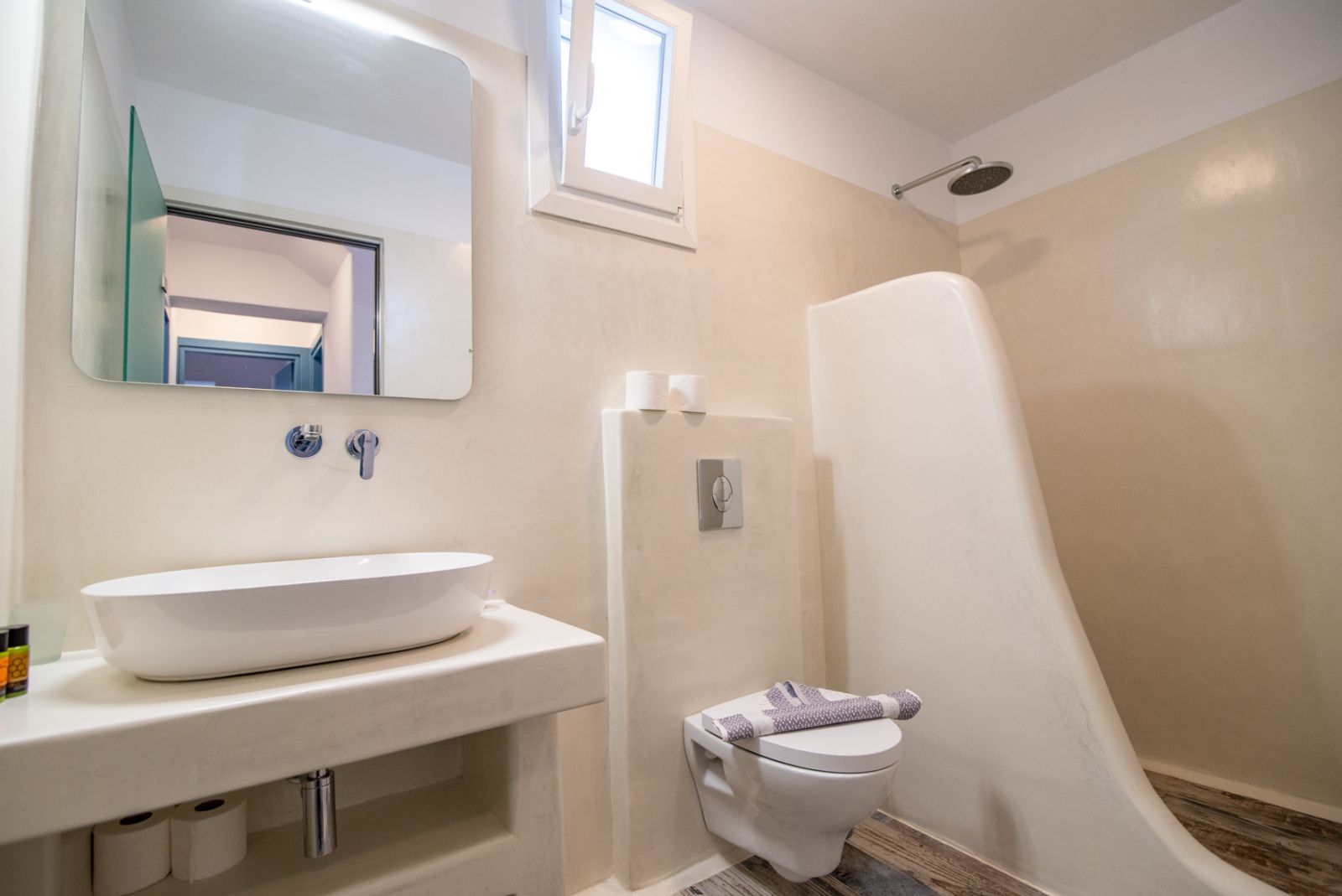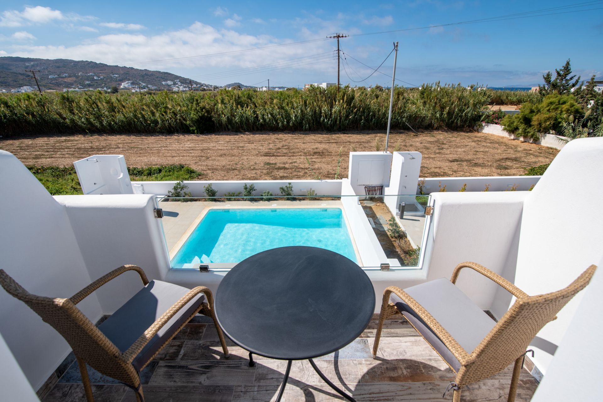 Within the villa premises lies a magnificent private swimming pool (6m x 5m), surrounded by meticulously designed outdoor living spaces that invite relaxation under the brilliant Cycladic sun. The expansive terrace accommodates comfortable lounging areas, alfresco dining settings, and tranquil corners for contemplation or conversation, all enhanced by the property's privacy and natural beauty.